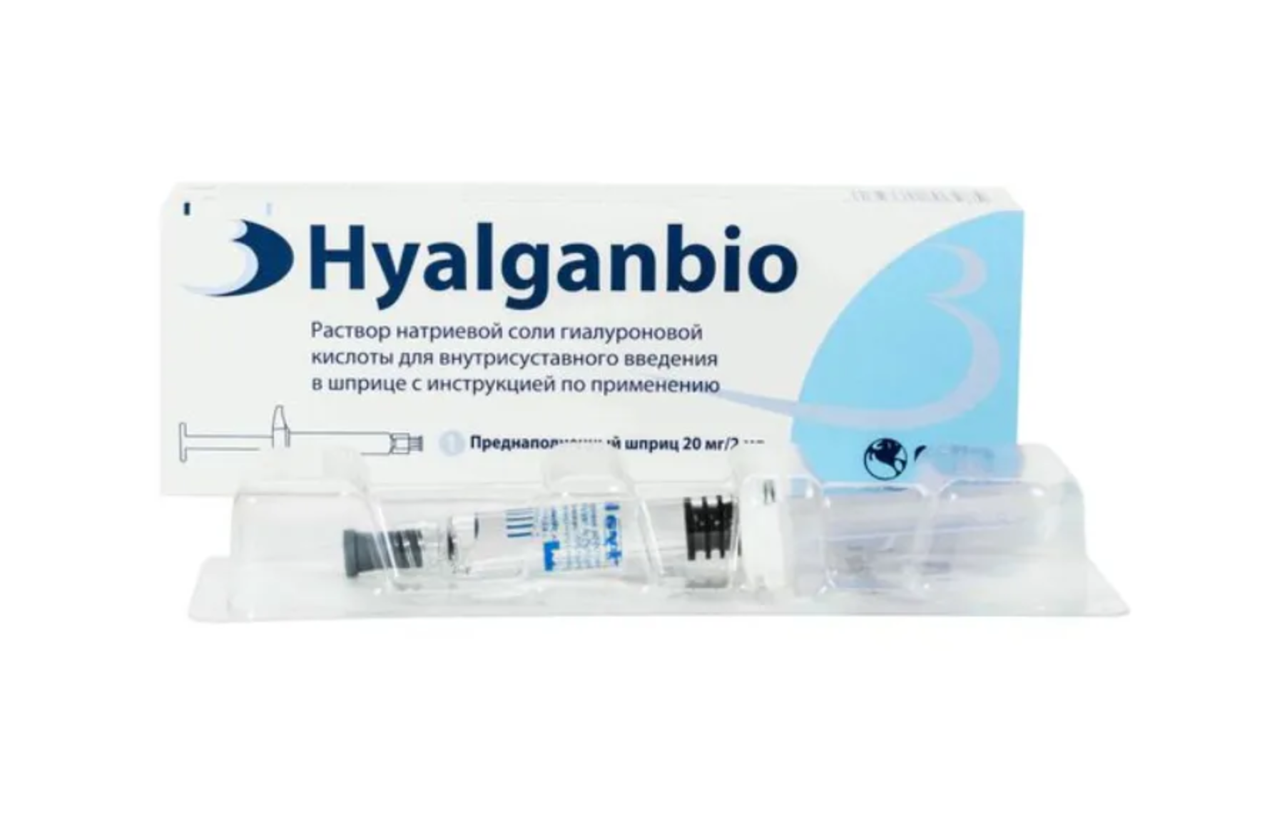 Основной компонент: натриевая соль гиалуроновой кислоты 20 мг/2 млВспомогательные компоненты: натрия хлорид, натрия дигидрофосфат дигидрат, натрия гидрофосфат додекагидрат, вода для инъекций. ИНФОРМАЦИЯ ОБ ИЗДЕЛИИ HYALGANBIO представляет собой высоковязкий раствор натриевой соли гиалуроновой кислоты с молекулярной массой 500-730 кДа в буферном физиологическом растворе натрия хлорида, pH 6,8- 7,5. Раствор (20 мг/2 мл), содержащийся в шприцах, поставляется стерильным и не содержит бактериальных эндотоксинов. Гиалуроновая кислота, полисахарид из семейства глюкозамингликанов, естественным образом представлена во многих человеческих тканях, например, в хрящах и синовиальной жидкости. Эндогенная гиалуроновая кислота обеспечивает вязкость и эластичность синовиальной жидкости, которые являются фундаментальными характеристиками для функционирования суставов. При травматических и дегенеративных заболеваниях суставов возникает недостаточное количество гиалуроновой кислоты и меньшая степень пол