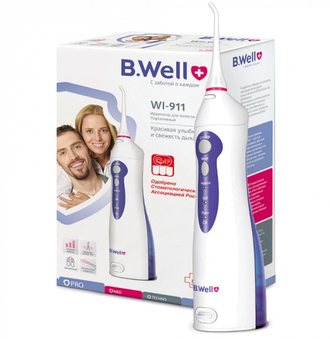 Высокая степень влагозащиты (IPx7), почти бесшумная работа и поворот насадки на 360 градусов делают модель удобной для использования. В комплект входят ирригатор B.Well WI — 911, стандартные насадки — 2 шт, резервуар для воды, мягкий чехол и зарядное устройство. Предусмотрены 2 способа наполнения резервуара.