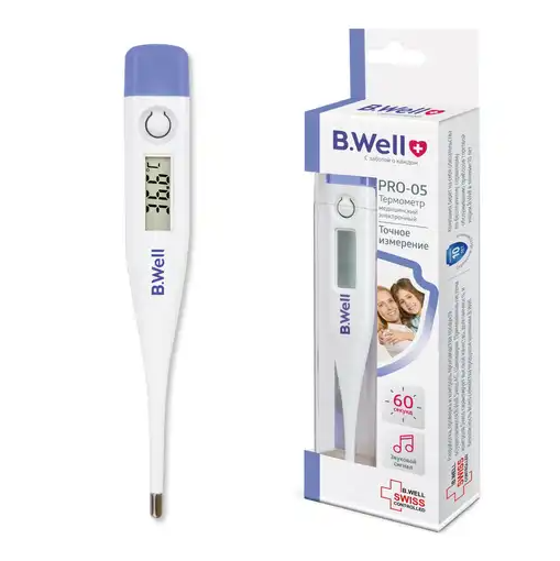 Электронный медицинский термометр B.Well PRO-05 — простой в использовании и точный прибор, который доступен для каждой семьи. PRO-05 – отличный вариант перехода от ртутных градусников к электронным термометрам. Электронный градусник PRO-05 сделан из безопасных материалов, не содержит ртути и стекла. Он удобен для детей и взрослых, имеет хорошо читаемый дисплей, память последнего измерения и скорость измерения от 1 минуты. Благодаря водозащищенному наконечнику и заменяемому элементу питания PRO-05 прослужит Вам долго!