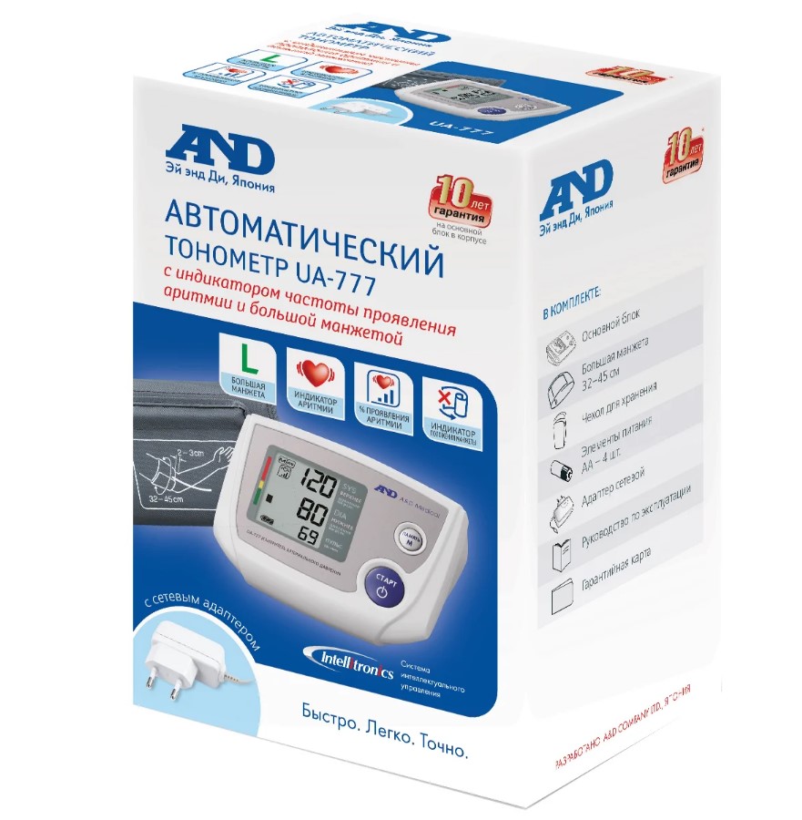 Автоматический тонометр UА-777 с адаптером и манжетой 32-45 см - современный и удобный тонометр-автомат с манжетой на крупную руку поможет точно и комфортно, без чрезмерного сдавления руки манжеткой, измерить давление благодаря системе «умного» управления Intellitronics и произвести оценку результата по шкале ВОЗ, устроенной по принципу светофора.