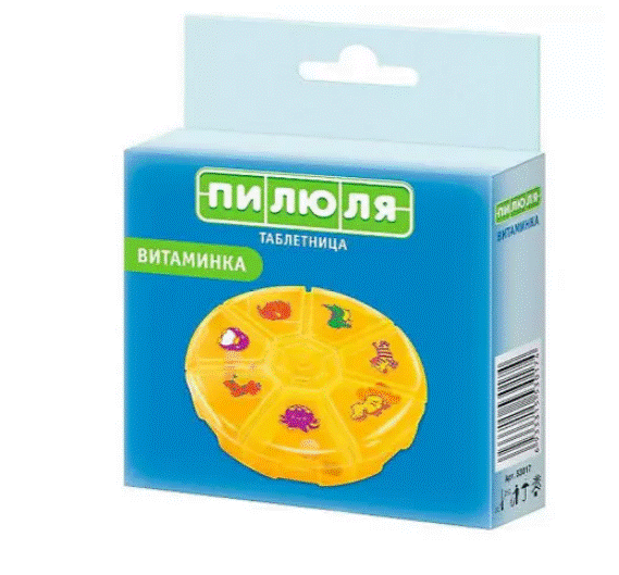 Таблетница состоит из семи отделений, соответствующих дням недели. Удобный и небольшой контейнер позволяет раскладывать лекарства один раз в неделю, вместо семи, обеспечивает их компактное хранение.