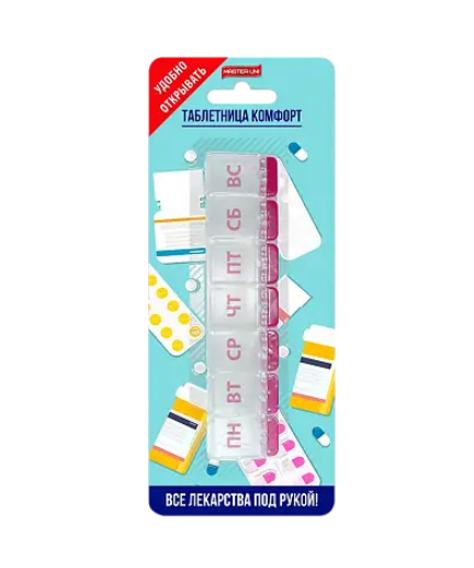 Таблетница пластмассовая с индивидуальными крышками и кнопками для комфортного использования. Предназначена для хранения лекарственных средств или витаминов в заводской упаковке.