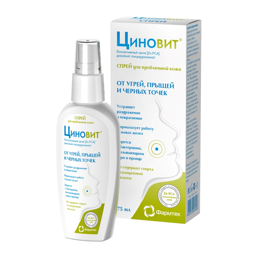 Спрей Циновит от угрей, прыщей и черных точек обеспечивает нормальный отток кожного сала, устраняет раздражение и покраснение. Не содержит спирта и салициловой кислоты.