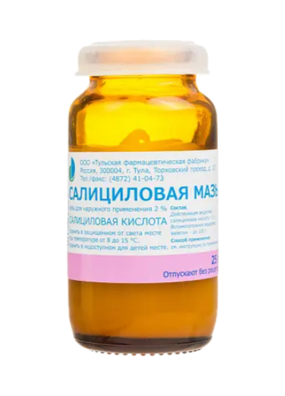100 г мази для наружного применения содержит:действующие вещества:кислота салициловая - 2 г,вспомогательные вещества:вазелин до 100 г.